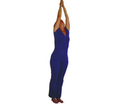 2. S nádechem zvedáme obě paže stranou do aňdžalí mudry a současně zakloníme hlavu.